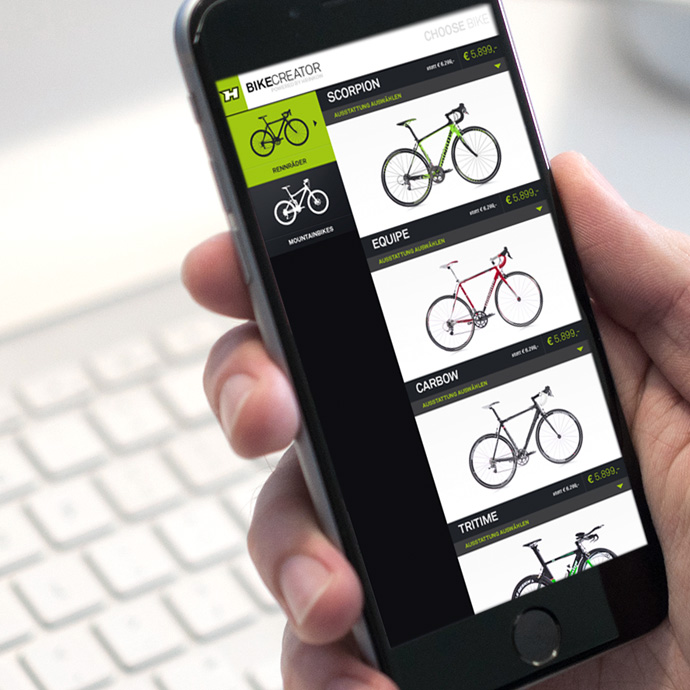 Hrinkow Bikecreator kommt als Verkaufstool in Form einer Web App zum Einsatz. Mit wenigen Klicks hat man eine Vielzahl an Möglichkeiten sein perfektes Rad online zusammen zu stellen.